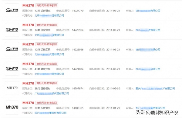 知识产权信息显示,在马航MH370客机失事事件后,多位企业及自然人提交"MH370""失联MH370"商标注册申请,国际分类包括广告销售、日化用品、运输工具等,这些商标申请均被驳回。