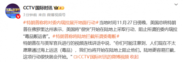 据@CCTV国际时讯,当地时间11月27日傍晚,美国总统特朗普在佛罗里达州表示,美国将"很快"开始在陆地上采取行动,阻止所谓的委内瑞拉"毒品贩运者"。