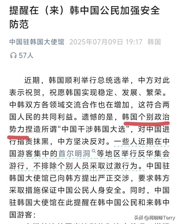中国驻韩国使馆日前发出安全提示,要中国公民加强安全防范,指出韩国个别政治势力捏造所谓"中国干涉韩国大选",对中国进行指责抹黑,甚至在中国游客集中的首尔明洞等地举行反华集会游行,不排除个别人员采取过激行为。