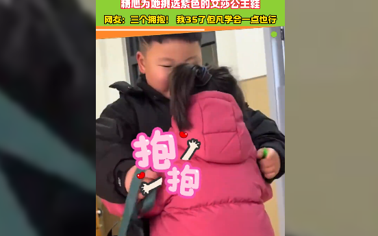 视频中,小男孩给幼儿园女同学准备了生日礼物,精心为地挑选紫色的艾莎公主鞋,女同学穿上后,超爱这礼物,高心的回应了男孩3个拥抱。网友:三个拥抱!我35了但凡学会点也行。