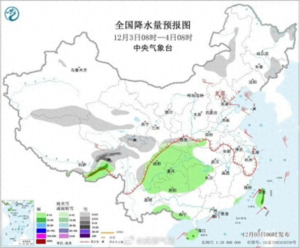 从全国降水量预报图来看,12月3日08时-4日08时,四川中东部、重庆、贵州、湖南等地被绿色降雨区覆盖,部分地区雨势温和;青藏高原东部、甘肃南部等地出现雨夹雪或雪(如图2所示)。到12月4日08时-5日08时,降雨区域仍稳定在西南、江南一带,重庆、贵州、湖南等地降雨持续,高原雨雪范围略有调整(如图1所示)。北方大部以晴或多云为主,仅东北局部有弱降雪。