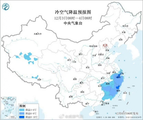 冷空气降温预报图中,12月3日08时-4日08时,浙江、福建、江西、广东北部等地成降温核心区,部分地区降温8-10℃,南昌、福州等城市单日降温可达6-8℃(如图4所示)。气象专家提醒,南方降温伴随阴雨,湿冷感明显,公众需及时添衣;北方虽降温稍缓,但后期气温也将逐步下滑。