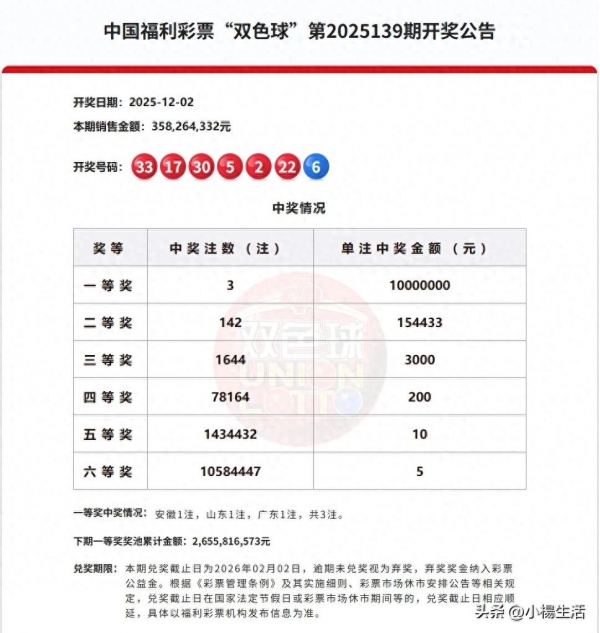 本期一等奖开出3注,每注奖金高达1000万元,分别被安徽、山东和广东的幸运彩民中得。