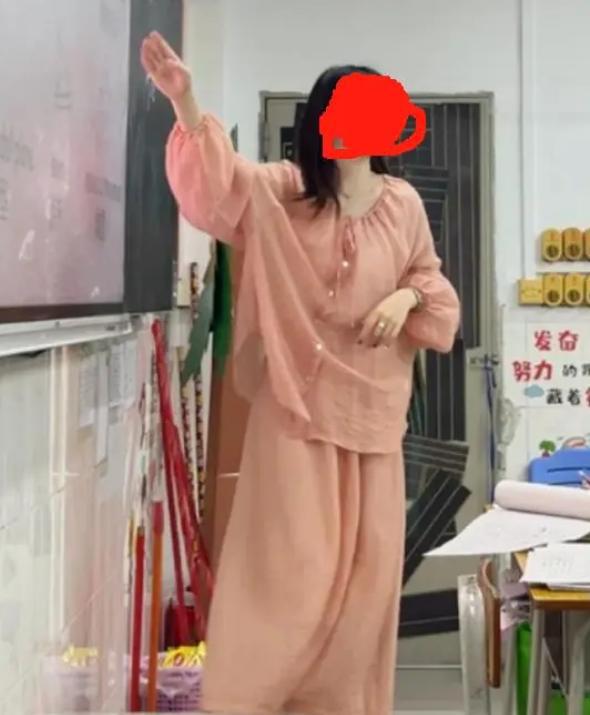 女教师并没有意识到自己的穿着有问题,有一次她穿着普通的粉色长袖长裙到班级去上课。