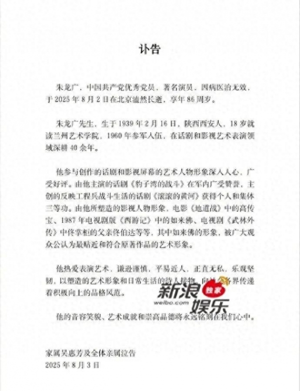 朱龙广的儿子在公告里说明老爷子因为生病治不好,在家里人陪伴下走了。他1939年出生,演过不少电视剧和电影。最出名的是1986年那版《西游记》里的如来,还有70年代《地道战》里的高传宝,后来还客串过《武林外传》里的佟掌柜他爹。这些剧现在还在各种视频平台放,每天都有人在底下刷弹幕。