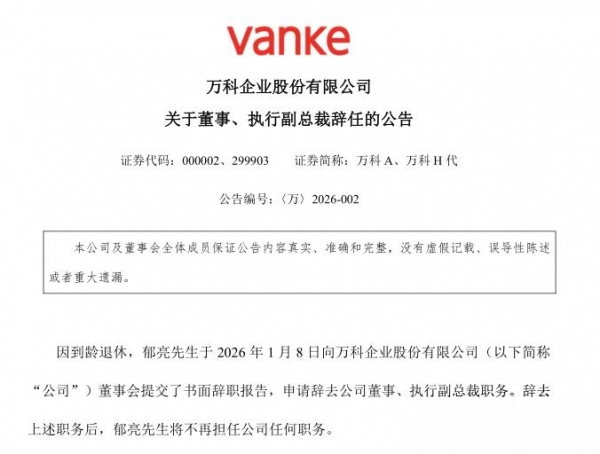 2026年1月8日,万科A(000002.SZ)一则公告引发地产圈震动:因到龄退休,郁亮向公司董事会提交书面辞职报告,辞去董事、执行副总裁职务。自此,这位陪伴万科36年的"老兵",将不再担任万科任何职务。