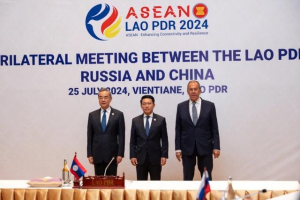 当地时间7月25日,中国、俄罗斯、老挝在万象举行三方外长会晤 图:外交部微信公众号