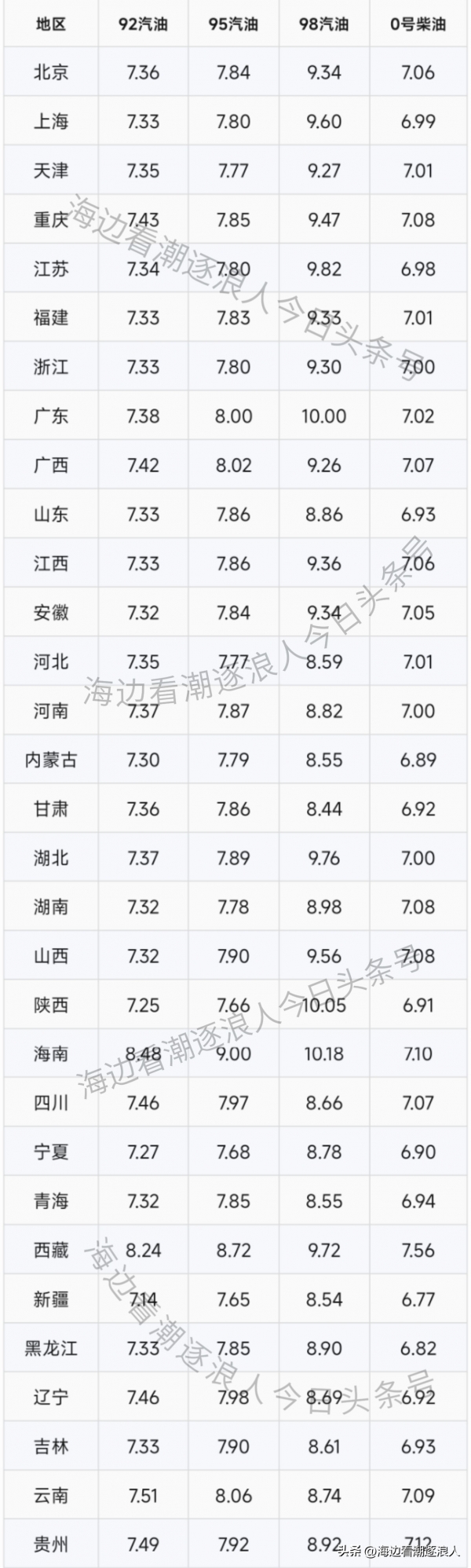 6月已经涨到7元时代的92号汽油,目前大部分地区已经超过7.30元/升。当然95号汽油,0号柴油等也继续上涨了。今日油价(7月2日)92,95号汽油与0号柴油请看下方油价列表,小编提醒大家今天的油价更贵了