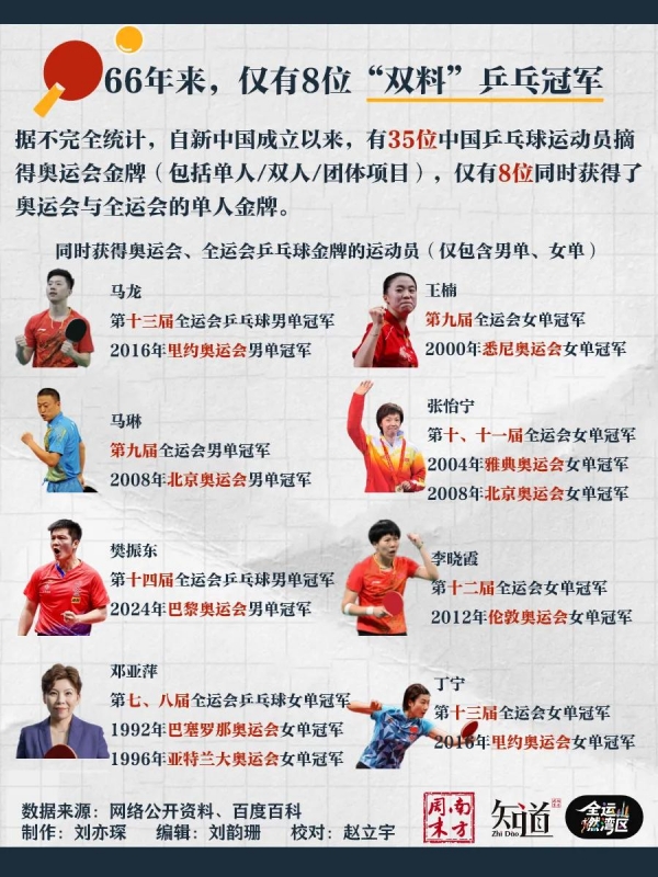 据不完全统计,自新中国成立以来,共有35位中国乒乓球运动员摘得奥运会金牌,但仅有8位同时获得了奥运会与全运会的单人金牌。