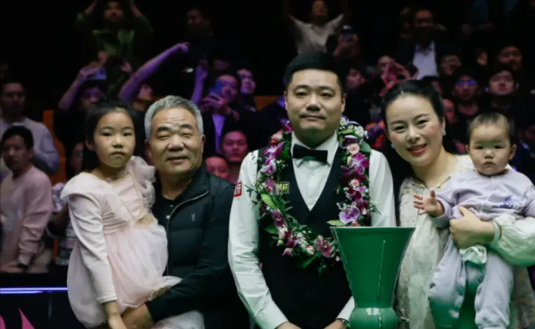 比赛结束后的颁奖典礼现场,充满了温馨的画面。丁俊晖的父亲带着大孙女现身,脸上洋溢着自豪的神情。丁俊晖的妻子张元元抱着小女儿也来到了现场。