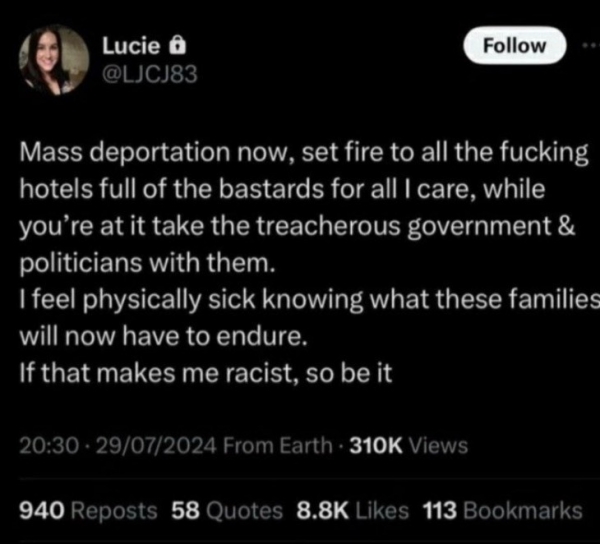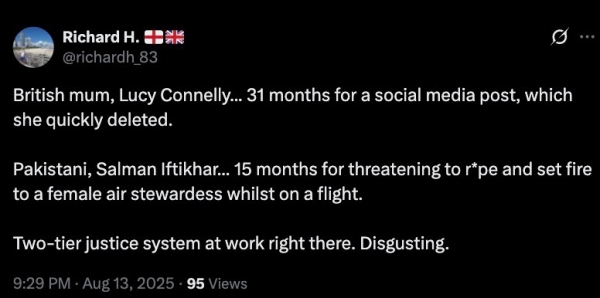 "英国妈妈Lucy Connolly推文快速删除判31个月;巴基斯坦人Salman Iftikhar威胁轮奸和焚烧空乘仅15个月。两级司法系统在运作,恶心。"