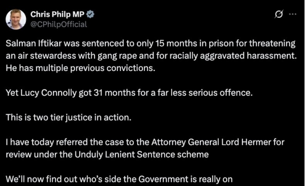 "Salman Iftikhar仅判15个月监禁,却有多次前科,包括威胁轮奸空乘;Lucy Connolly一条不当推文删掉后判31个月。这是'两级司法'。我已提交过分宽大判决审查。"