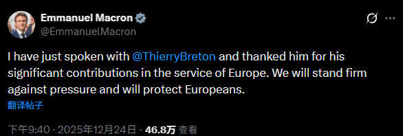 法国总统马克龙则为法国公民"撑腰"。他同日在X平台发文表示,已与布雷顿通话并感谢其工作,"我们不会放弃,将继续保护欧洲的独立性和欧洲人的自由"。
