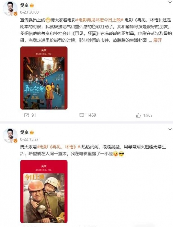 吴京作为出品方之一,本该给影片带来更多关注,但结果却适得其反。登峰国际主控发行,宣传时主打"吴京力荐",可电影质量摆在那里,观众根本不买账。同期上映的《戏台》虽然也是小成本,但服化道用心,剧情紧凑,观众评价高出《再见,坏蛋》一大截。有网友说,吴京要是把《战狼》那套认真态度用在这部电影上,可能不会这么惨。