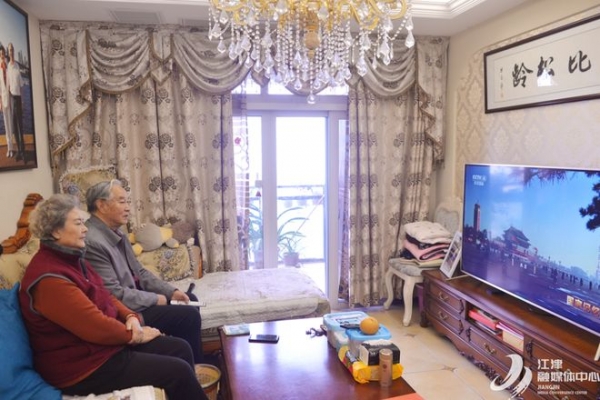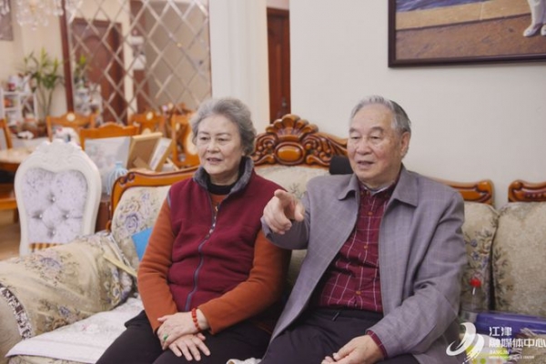 ▲邓若曾夫妇在白沙家中收看《国家记忆》纪录片《女排娘家》