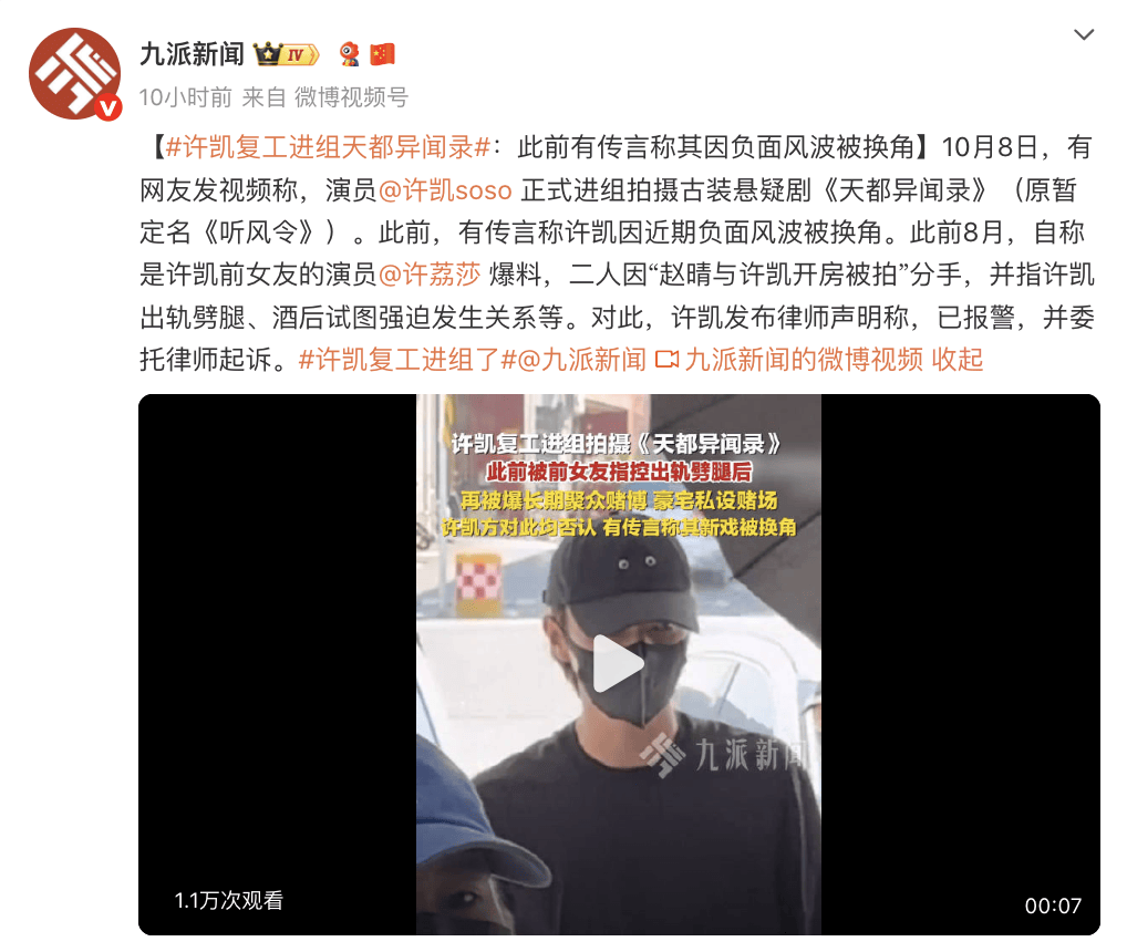 10月8日,有网友发布视频称,演员许凯已正式进入剧组,投入古装悬疑剧《天都异闻录》(原暂定名《听风令》)的拍摄工作。此举也被视为对早前"因负面风波被换角"传言的直接回应。