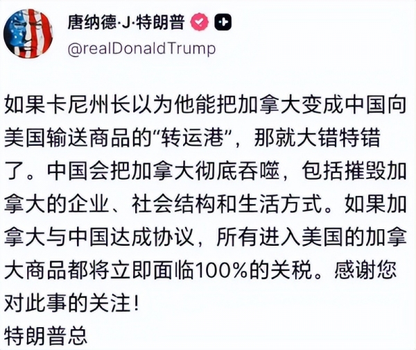 让加拿大民众非常不满的是,特朗普的文章中再一次称加拿大是美国的"第51个州",全然不顾加拿大作为主权国家的基本尊严,喊话"卡尼州长"别想让加拿大成为中国转口贸易的地区。他还使用之前"侮辱性"的语言抹黑中加合作,表示要是自己不管不问,加拿大"会被中国彻底吞噬,摧毁当地的企业、社会结构以及整体的生活方式。