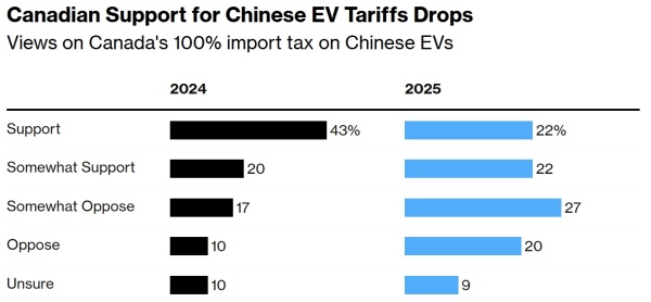 报道提到,加拿大民众对电动汽车关税的看法也正在发生变化。纳诺斯研究公司开展的最新调查发现,目前有44%的加拿大人支持该关税政策,低于去年的63%。