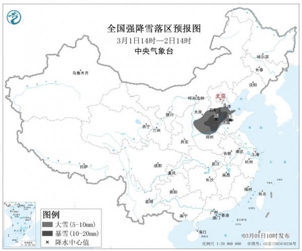 而北方还有场重点雪,尤其是山西、河北、河南交界处,还有内蒙古东部。今天北方的降水强度会有所加强,降水的相态也比较的复杂,在河北的南部、山西的南部、河南北部一带会成为降水的中心,今天上午中央气象台也继续发布了暴雪的蓝色预警,山西的中南部、河北中南部、河南北部等地的部分地区会有大到暴雪。
