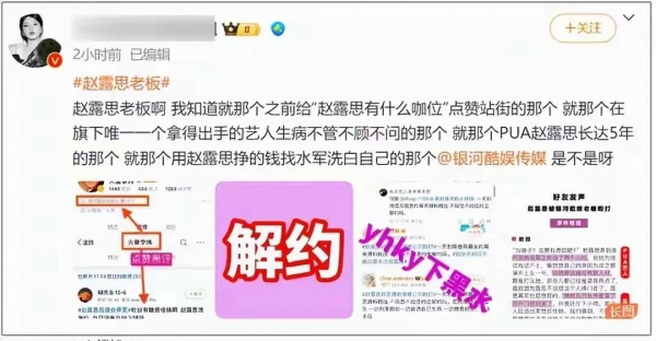 有个赵露思的铁杆粉丝,把她前老板的身份爆出来了,竟然是银河酷娱创始人兼CEO李炜。这消息一出来,大家都惊到了,原来伤害赵露思的是他呀。而且,还有网友挖出李炜以前是湖南台栏目制作人,以及银河酷娱的一些黑料。早在2019年,就有员工爆料说银河酷娱的领导又行贿,又打骂下属,品行特别恶劣。这个李炜到底是个什么样的人啊?为啥要对赵露思下这么狠的手呢?