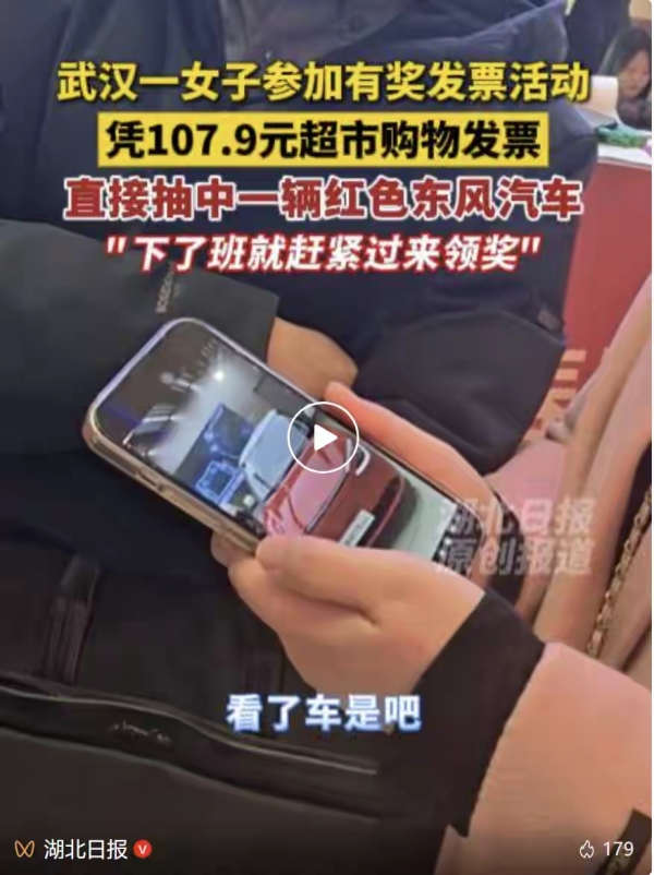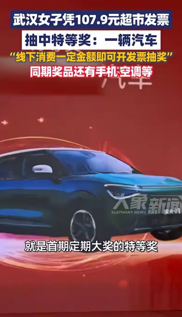 这事其实是湖北搞的"乐购湖北"活动。从1月24号开始,只要在湖北实体店消费满100块,让商家开电子发票就能抽奖。有两个玩法:一种当场就能知道自己有没有中800块内的小奖,直接打到银行卡;另一种是定期开奖,分三期。第一期是1月24号到2月2号开的发票来抽,特等奖就是那辆汽车,还有手机、空调这些奖品。