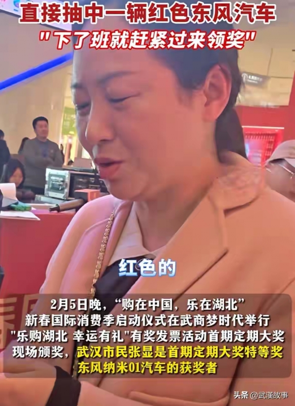 武汉有个阿姨叫张显,正月初九晚上接到电话说抽中了一辆新能源车,当时还以为是骗子。结果真给她抽到了!这个车是东风纳米01,价值好几万,在超市买菜花了107块9开的发票拿的奖。她说自己跑了9次抽奖,之前还拿过4次10块红包,运气确实不一般。