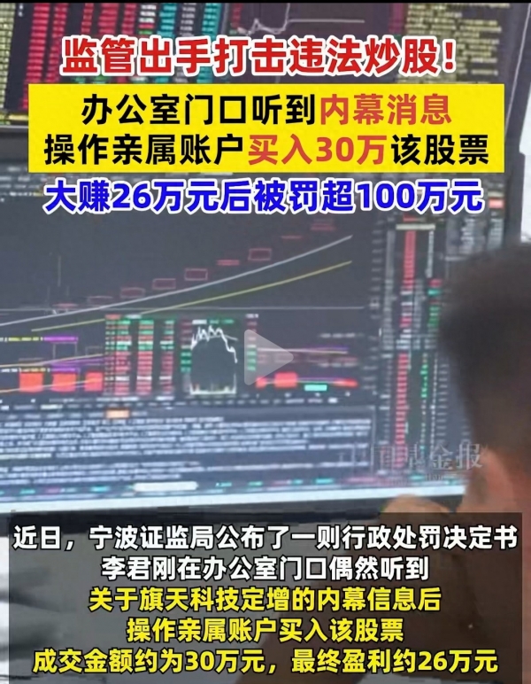 宁波证监局最新披露的一则行政处罚决定书引发热议。当事人李君刚在办公室门口偶然听到上市公司旗天科技的定增内幕消息后,火速用亲属账户买入股票,短短两个月狂赚26万元!然而,这笔"横财"最终被全部没收,还被重罚80万元,堪称"偷鸡不成蚀把米"。