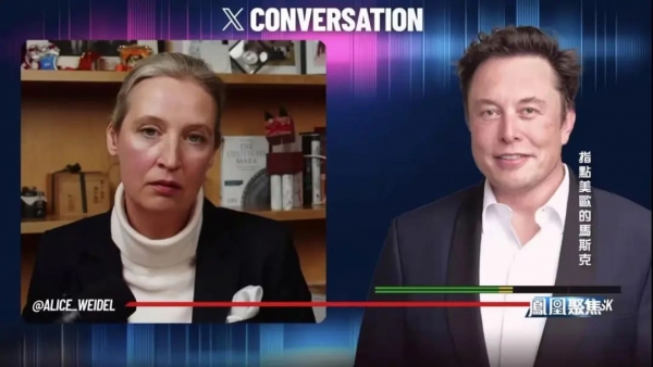 当地时间1月9日,马斯克与一位从未谋面的党派领导人开启了一场长达75分钟的线上对话。这场对话在马斯克旗下的社交媒体平台X进行直播,高峰期时超过20万人同时在线围观。与马斯克对话的女领导人名叫魏德尔,是德国极右翼政党德国选择党的党首,以及德国大选候选人。