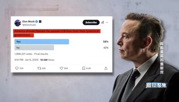 1月6日,马斯克在他的X账号上发了一项投票,标题是:"美国是否应该将英国人从暴政政府中解放出来。"他将投票置顶,邀请2.11亿粉丝参与,结果58%的人回答是的。