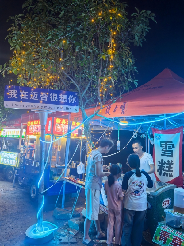 村民的生活因游客的到来日益丰富与便利。这里本只有一家小卖部,而如今小吃摊位有八九十家。在小吃街内一家雪糕摊位旁,一块"我在迈合很想你"的路牌吸引路人合影。摊主全夏阳(化名)向九派新闻介绍,这是他与几位朋友定制的"网红路牌"。