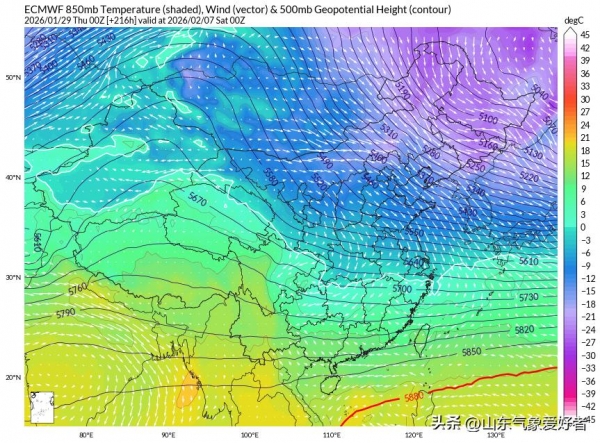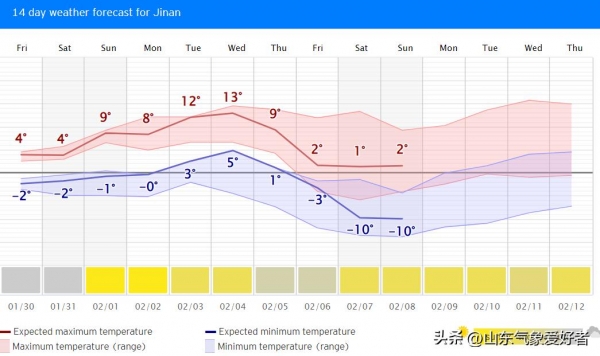 但是这次大回暖过程并不会持续太久,西伯利亚上空新一轮强冷空气正在酝酿。根据超级计算机的预测数据,2月6日起这股较强冷空气将自北向南影响我国中东部大部地区,也将给山东制造显著的大风降温过程。以省会城市济南为例,数值预报指出2月2~5日当地气温明显偏暖,最高气温可达到13℃,天气非常温暖。
