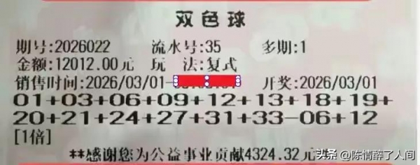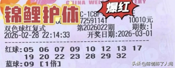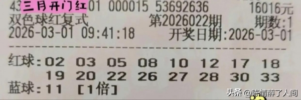 大家好!今天是2026年3月1日,周日,今晚双色球26022开奖,在上期双色球开出 6注一等奖后,本期双色球奖池滚存为26.8亿。本期开奖号码:红球:15、18、23、25、28、32蓝球:11。后区开出了1个2路奇数11号,蓝球振幅7点。