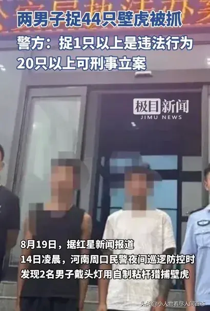 近日,河南周口有两名年轻人捕捉了44只壁虎而被刑拘,就是刑事责任,人生就有污点了。