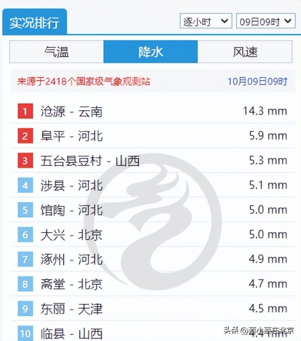 我们来看下截止到今天上午的九点,也就是上班前,除了云南以外,全国降水排名前十的地方有9个都是在京津冀和山西,一场秋雨一场寒,这轮降水结束后肯定有一轮较强降温,大家一定要注意保暖哦。我们接下来再看一下未来10天的天气预报。