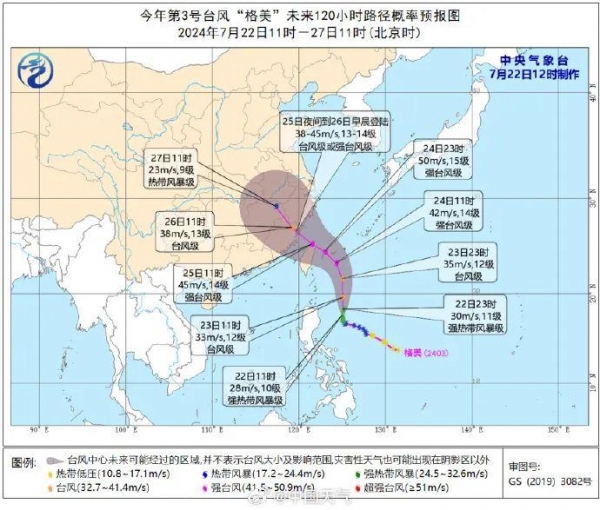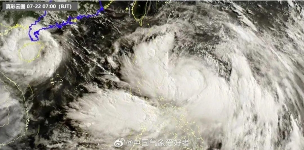 7月22日早晨最新的卫星云图显示,台风"格美"把东边的小台风胚胎都吃掉了。带来了两个后果,一个是吃撑了,强度发展缓慢,另一个是吃成了一个巨无霸台风。