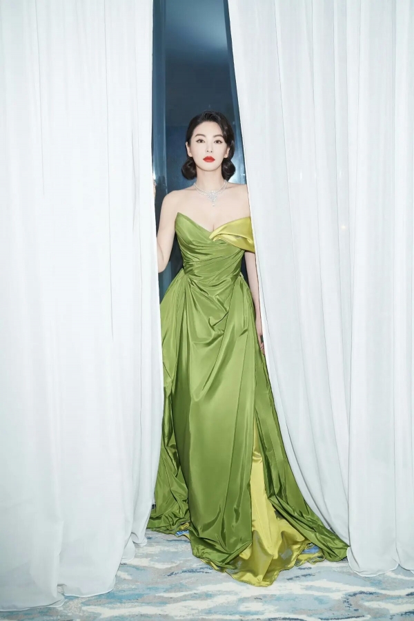 不得不说,下面这一身时髦的绿色连衣裙真的很显肤白,绿色本身就属于一种能够修饰皮肤的颜色,作为冷色调的绿色,对于黄皮女生尤为友好,而张雨绮搭配牛油果绿色连衣裙配合了复古的盘发,看上去别有一番风情。