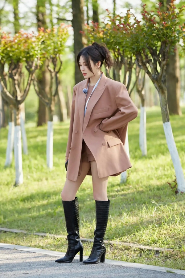 西装在秋天已经开始逐渐进入大家的视线了,如果你在购买西装的时候并没思路的话,可以看张雨绮选择这样的棕色西装外套去搭配,这样的阔型西装超显瘦,垫肩的设计修饰头肩比,搭配着黑色长筒靴修饰腿长,真的很酷。