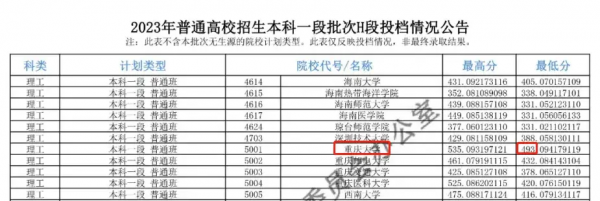 2024年青海省高校专项计划提前批理工类投档中,985高校重庆大学最低投档线 361分 ,位次14767,和最高分449分差了整整88分,甚至比同样位于重庆的211高校西南大学419分还低了58分,比非985非211的西南政法大学481分低了120分。而同是985的中南大学最低投档线429分,华南理工大学416分,比重庆大学高了五六十分。