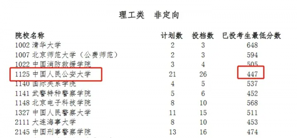 而在宁夏理工提前批招生中,中国人民公安大学投档最低分447分,超理科一本线15分。