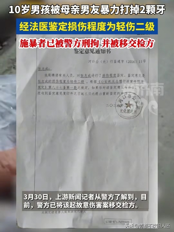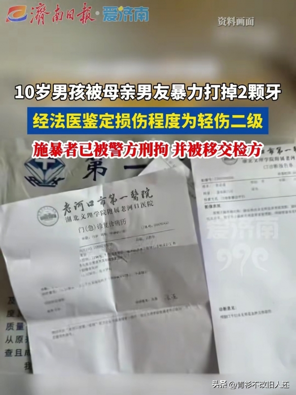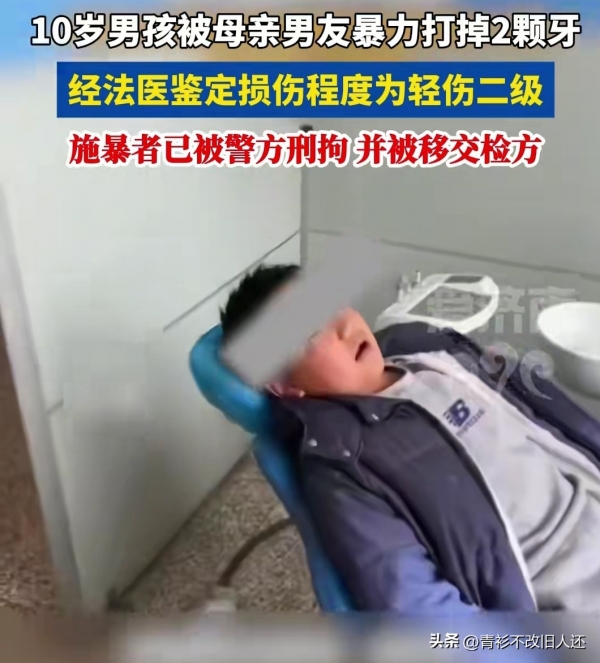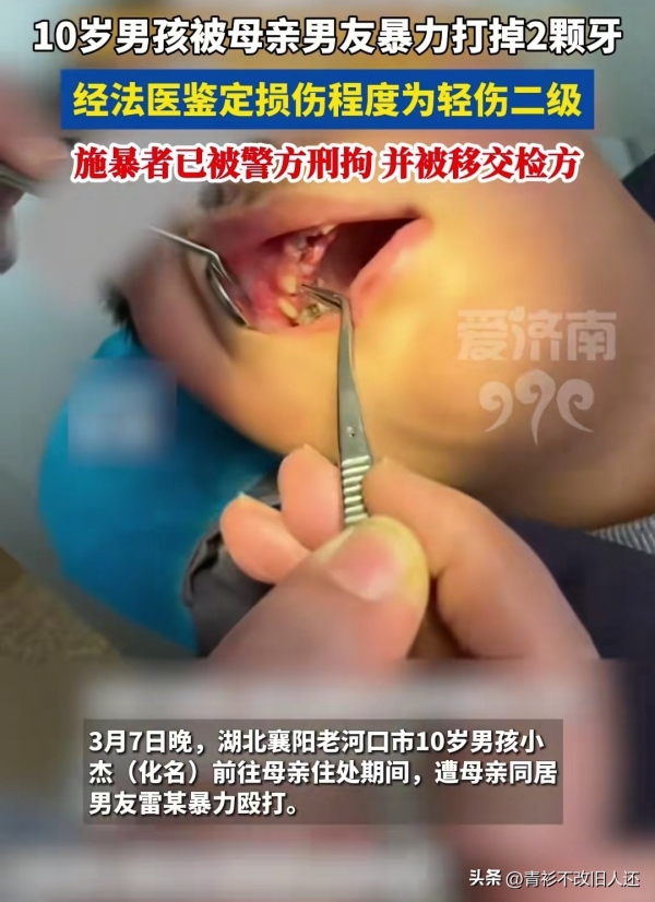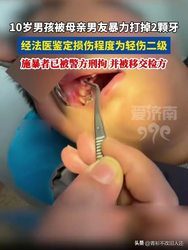 10岁男孩上厕所关门撞到母亲男友,被母亲的同居男友两拳打掉两颗牙,法医鉴定轻伤二级。