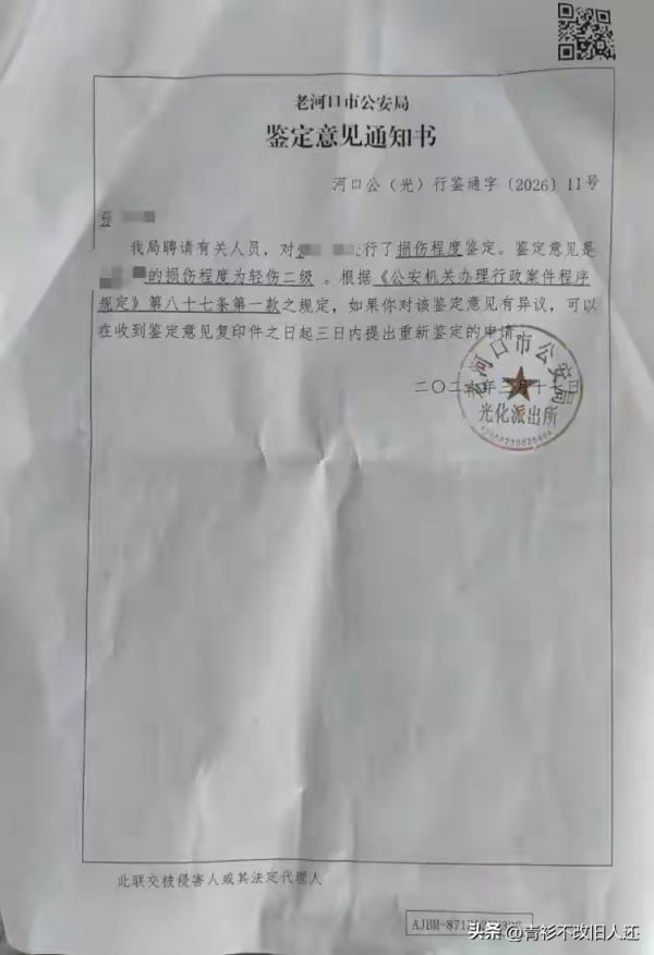 老河口市公安局的鉴定意见通知书已经出来了:轻伤二级。这个术语可能很多人没概念,简单说,这已经够刑事立案了。