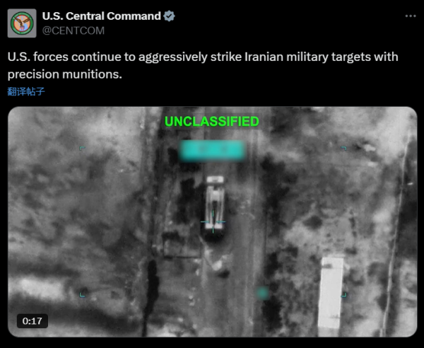 美国中央司令部在社交平台上发布了一段设施被炸毁的视频,并配文"美军继续使用精确制导武器,积极打击伊朗军事目标"。