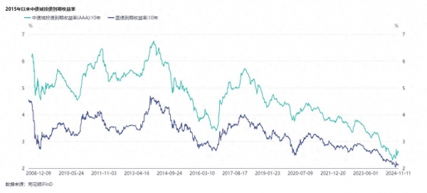 2017年金融去杠杆,以及2022年四季度、2024年8-9月出现的两轮"理财赎回潮",令城投债相比国债的利差一度有所回升,但随着化债举措陆续出台,两者利差整体呈现回落态势。