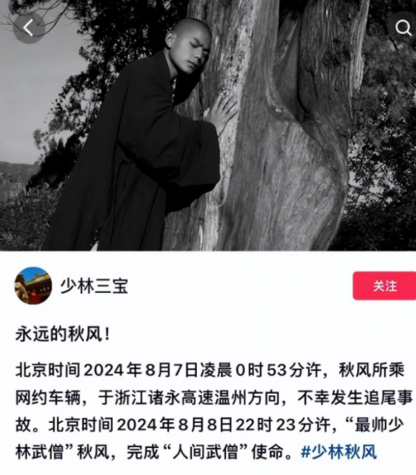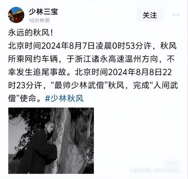 可惜天妒英才啊。8月8号,秋风在回国参加公益演出的路上,遇到了车祸。抢救无效后,这个阳光帅气的小伙子永远离开了我们。少林寺的人都说,秋风的离世是中华武术界的重大损失。