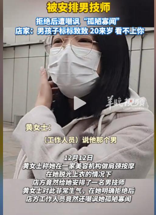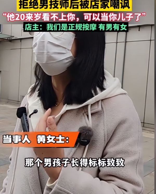 之后,黄女士找店家讨要说法,但店家解决问题的态度并不积极,店家甚至嘲讽地说:你太孤陋寡闻了,男技师按摩很正常,人家是小伙子,看不上你。