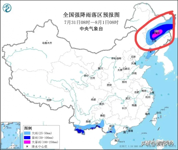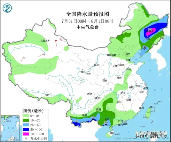 7月31日08时至8月1日08时,黑龙江中东部、吉林中西部、辽宁中部、云南南部、广西南部等地部分地区有大到暴雨,其中,黑龙江南部、吉林北部等地部分地区有大暴雨(100~180毫米)。黑龙江西南部、新疆南疆盆地和东部等地部分地区有4~6级风,其中,新疆东部部分地区有7~8级风