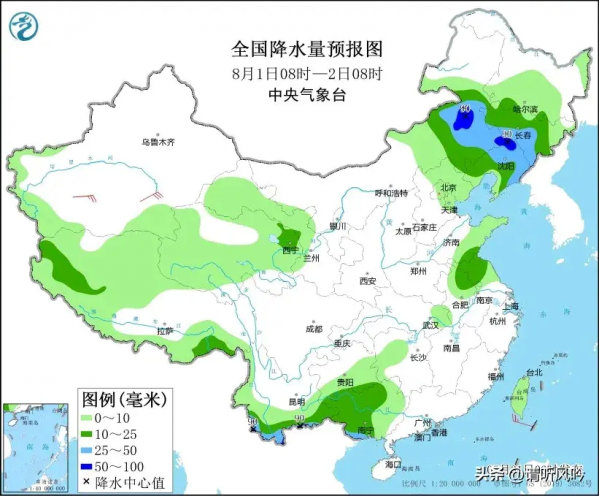 8月1日08时至2日08时,内蒙古东部、东北地区大部、广西南部、云南南部等地部分地区有中到大雨,其中,内蒙古东部、辽宁北部、云南南部、广西南部等地部分地区有暴雨(50~90毫米)。新疆南疆盆地部分地区有4~6级风。