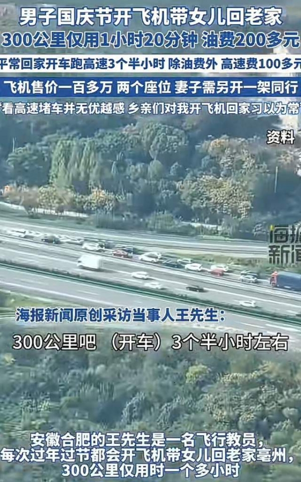 这事儿,真是让人觉得"羡慕嫉妒恨"啊! 安徽合肥的王先生,逢年过节,竟然开着飞机带女儿回老家! 300公里,1个多小时就到,油费才200多块! 这简直是"人生赢家"啊!