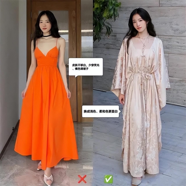 大红大紫等浓郁颜色往往会给人压力感,尤其是中年女性若肤色没有那么白皙,这样的裙子还可能会加深肤色的暗沉,造成"花枝招展"的负面印象。