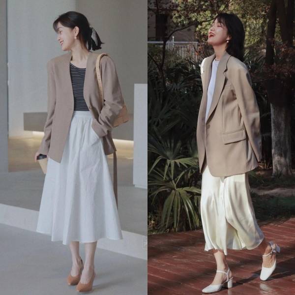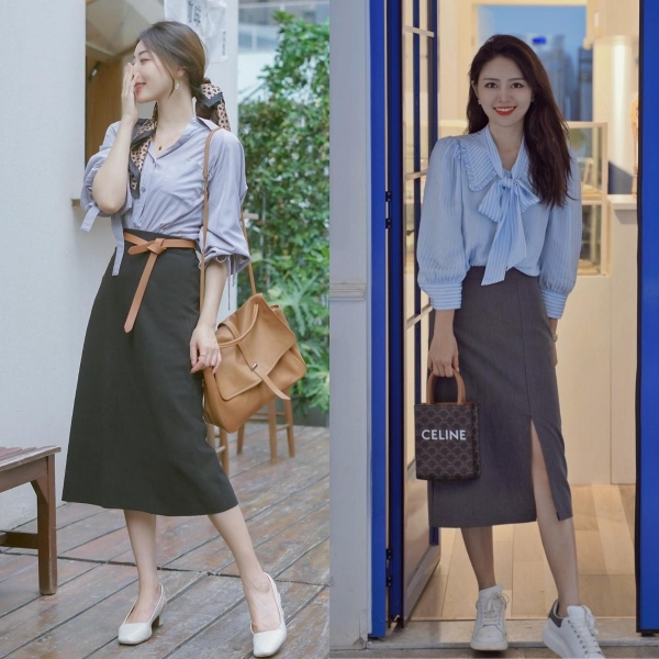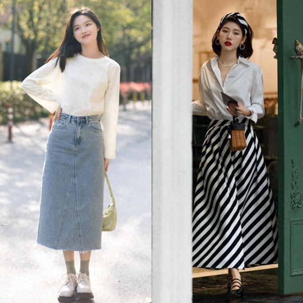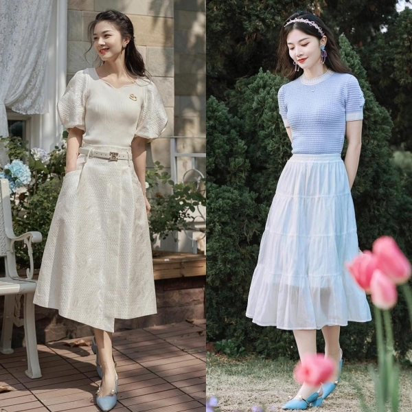 穿着上衣时不妨考虑版型更为合身的选择,如精致的衬衫或合体的打底衫。与下摆宽松的裙子搭配,易于塑造"上紧下松"的黄金比例。尤其当上衣塞入裙腰时,可强调腰身,同时达到拉长身形的目的,实现高挑、瘦身的视觉效果。